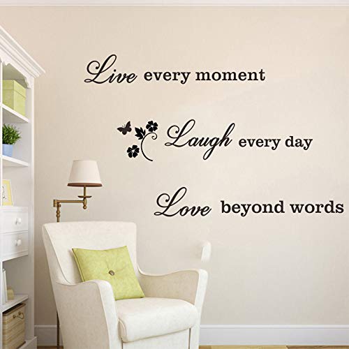 Il pacchetto include: 1 adesivo da parete in vinile "Live every moment Laugh every day Love beyond words"(Vivi ogni momento Ridi ogni giorno Amore oltre le parole), dimensioni: 70 x 50 cm, colore: nero.