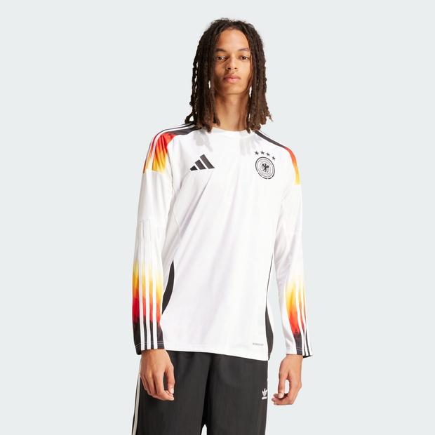 Celebra lo spirito del calcio tedesco. Questa maglia Home adidas della Germania combina tutti i simboli dei quattro volte campioni del mondo. Un motivo ispirato alle piume d'aquila impreziosisce le spalle, mentre i dettagli in rilievo ripresi dal logo DFB rifiniscono la parte anteriore. La struttura a maniche lunghe presenta la tecnologia antiumidità AEROREADY che mantiene la pelle fresca e asciutta, mentre lo stemma in tessuto rifinisce il modello. Questo prodotto è realizzato al 100% con materiali riciclati. Implementare la nostra produzione con materiali riciclati ci permette di ridurre gli sprechi, l'utilizzo di fonti non rinnovabili e l'impatto ambientale dei prodotti che produciamo. Vestibilità aderente. Girocollo a coste. Interlock, 100% poliestere riciclato. Pannelli laterali e parte inferiore della schiena: tessuto a nido d'ape, 100% poliestere riciclato. AEROREADY. Inserti in mesh sui lati e sulle maniche.