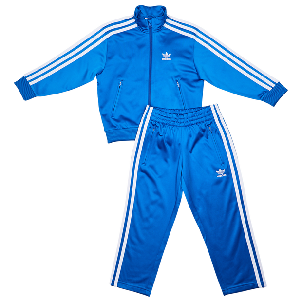 Your little one will be as bold as fire in this kids' iconic track suit. Inspired by adidas heritage yet fresh for today, it features 3-Stripes and a Trefoil logo on both the track top and pants. Ribbed details and a stand-up collar put the finishing touches on the classic silhouette. This product is made with 100% recycled materials. By reusing materials that have already been created, we help to reduce waste and our reliance on finite resources and reduce the footprint of the products we make. Loose-fit top and regular-fit pants. Top: Full zip with stand-up collar. 100% polyester (recycled). Top and pants: Side pockets. Top: Ribbed cuffs and hem.