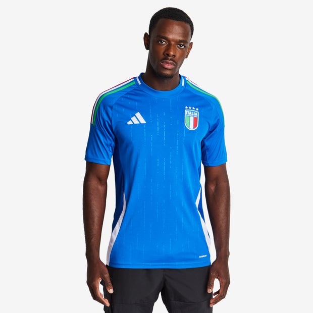 Mostra la tua passione per la Nazionale italiana. Nella maglia Home, l'iconico azzurro è messo in risalto dalle tre strisce adidas nei toni del tricolore. Creata per i tifosi, è realizzata in morbido tessuto AEROREADY ed è rifinita dallo stemma della Nazionale sul petto che completa alla perfezione il look iconico. Questo prodotto è realizzato al 100% con materiali riciclati. Implementare la nostra produzione con materiali riciclati ci permette di ridurre gli sprechi, l'utilizzo di fonti non rinnovabili e l'impatto ambientale dei prodotti che produciamo. Vestibilità aderente. Girocollo a coste. Interlock, 100% poliestere riciclato. AEROREADY. Pannelli in mesh sotto le braccia, sui lati e sulla parte bassa della schiena.