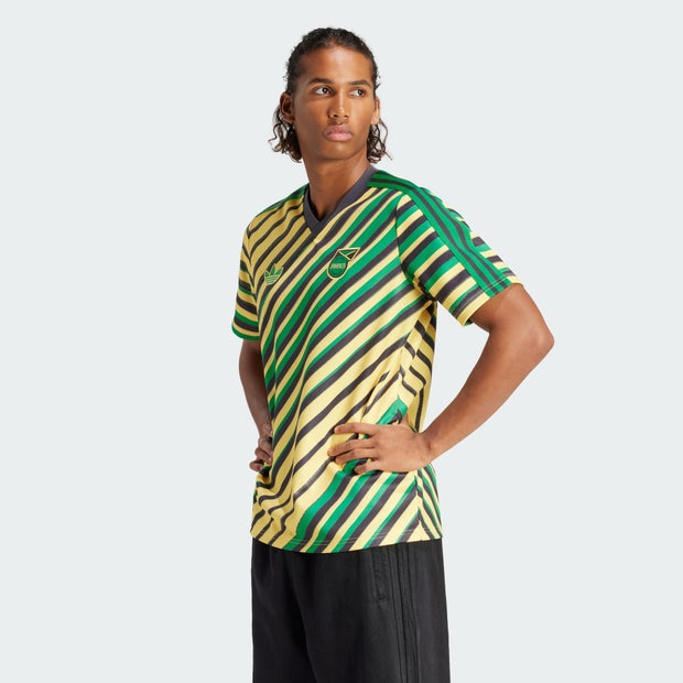 Show your love for Jamaica in a soft jersey designed to make you stand out. Inspired by the vibrant Jamaican culture, the Jamaica Trefoil Jersey brings the iconic federation crest and Trefoil logo over its black and white backdrop, creating a harmonious blend of football pride and contemporary urban style. Crafted from a smooth fabric and perfect for daily wear, the graphic jersey will add expression to your looks everywhere you set foot. Pair it with your favorite jeans or cozy sweatpants and be ready to steal the show. Made with a series of recycled materials, and at least 60% recycled content, this product represents just one of our solutions to help end plastic waste. Regular fit. Ribbed V-neck. 100% recycled polyester piqué. Jamaica embroidered crest.