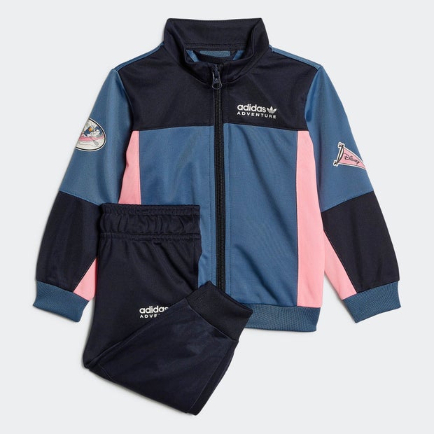 Disney's Mickey Mouse and friends know a thing or two about a great expedition — and now, little ones can dress for it. Made of soft, durable tricot, this outdoor-inspired adidas set for infants goes colourful in ultimate comfort. A full-zip jacket with a stand-up collar keeps them warm, and ribbed cuffs on the pants create a tapered shape. Mickey Mouse takes a breather on the back, relaxing in fresh air as the day rolls by. Made with 100% recycled materials, this product represents just one of our solutions to help end plastic waste. Regular fit. Top: Full zip with stand-up collar. 100% recycled polyester tricot. Top and pants: Ribbed cuffs and hem. Top: Side pockets.