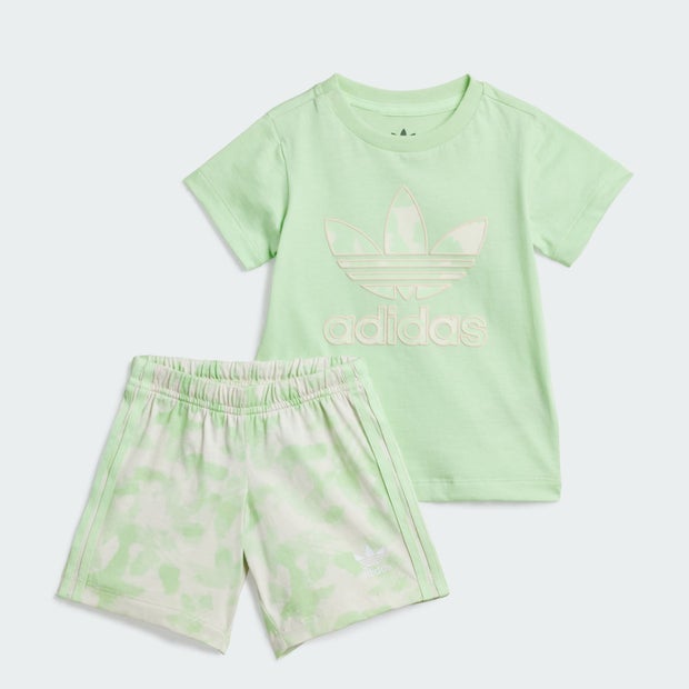 Warm-weather style for infants is looking fresh. This adidas set pairs a coordinated top and shorts for comfort that delivers sunny vibes for all-day wear. Signature 3-Stripes down the sides of the loose-fitting shorts and an infilled Trefoil logo on the tee connect even the littlest ones to the heritage and history of adidas. The cotton in this product has been sourced through Better Cotton. Better Cotton is sourced via a chain of custody model called mass balance. This means that Better Cotton is not physically traceable to end products. Find out more here: https://bettercotton.org/who-we-are/our-logo/ Regular fit. Top: Ribbed crewneck. 100% cotton single jersey. Shorts: Drawcord on elastic waist.