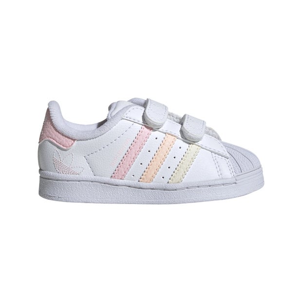 From the courts to the streets, the adidas Superstar shoes have redefined culture for over 50 years. This version for infants features elastic laces and hook-and-loop straps to make getting ready to head out a breeze. The iconic shell toe and serrated 3-Stripes pay homage to a legacy of expression. Let little feet stand out in style while a moulded sockliner keeps them cosy all day. The adidas Superstar is made to move — give the next generation a head start. Regular fit. Elastic lace closure. Leather upper. Moulded sockliner. Textile lining.
