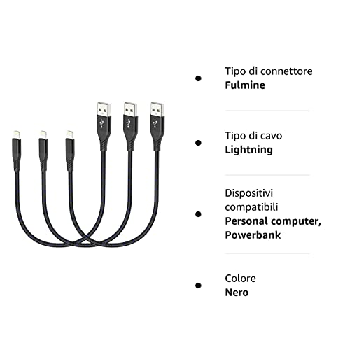 Cavo Lightning corto: questo cavo Lightning è compatibile con i seguenti dispositivi Lightning: iPhone 11 / XS / XS Max / X / XR / 8 Plus / 8 / 7 Plus / 7 Plus / 7 / 6s Plus / 6s / 6 Plus / 6 / 5s / 5c / 5 e il più recente sistema iOS.