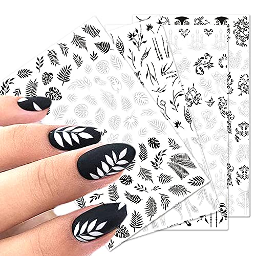 Adisno 10 Fogli Foglie in Bianco e nero Modello 3D Adesivi, Fai da Te Decorazioni Arte Unghie Autoadesivi, Adesivi per Unghie Decalcomania Trasferimento ad Acqua per Decorazione Unghie