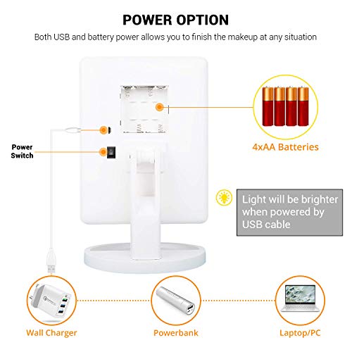 ADOV Specchio Trucco, Cosmetico Illuminazione 24 LED Illuminato Vanity Specchio Portatile Tavolino con 10x Lente Ingranditore, Tocca Luci Regolabile Schermo, USB Gestito e Rotante 180°- Bianco