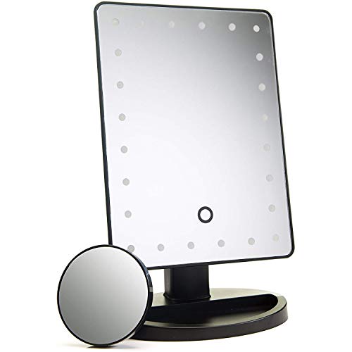 ADOV Specchio Trucco, Cosmetico Illuminazione 24 LED Illuminato Vanity Specchio Portatile Tavolino con 10x Lente Ingranditore, Tocca Luci Regolabile Schermo, USB Gestito e Rotante 180°- Nero