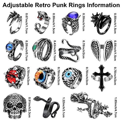 【Set di anelli gotici vintage】Un ordine include 15 anelli punk gotici, tutti gli anelli punk vintage in stili diversi. Riceverai anello del drago, anello del serpente, anello dell'artiglio, anello del teschio, anello del polpo, anello dell'occhio del diavolo, anello del malocchio, ecc. Stile Muti per soddisfare le diverse esigenze di abbinamento, mostrare il tuo stile punk vintage e renderti accattivante.