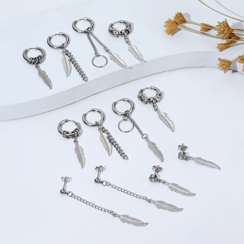 Adramata Orecchini in Acciaio Inossidabile Uomo Nero Argento Orecchini a Catena Kpop Cerchio Croce Punk Gotici Piuma Orecchini Set