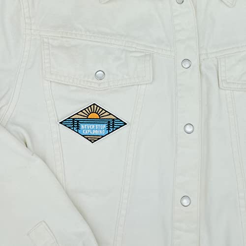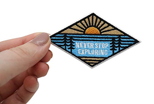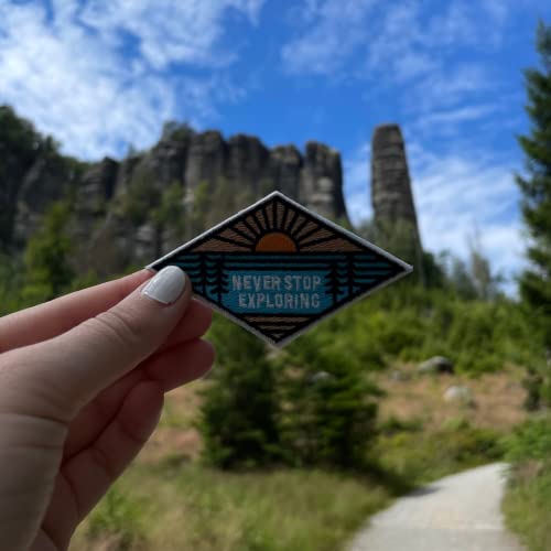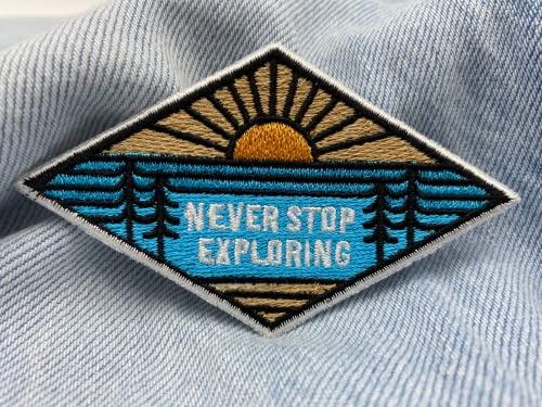 Adventure Collection Finally Home - Toppa termoadesiva con scritta “Never Stop Exploring”, da applicare con il ferro da stiro e da cucire, per escursionismo, esterni, sole e montagne, per lo zaino