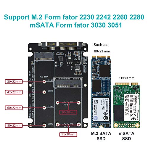 [Compatibilità SSD] mSATA a dimensione intera 30*30mm o mezza dimensione 30*50mm. SSD SATA M.2 di dimensioni 22*30mm o 22*42mm o 22*60mm o 22*80mm. Per M.2 NGFF SSD, supporta solo basato su SATA, che è con connettore Key B / B+M.