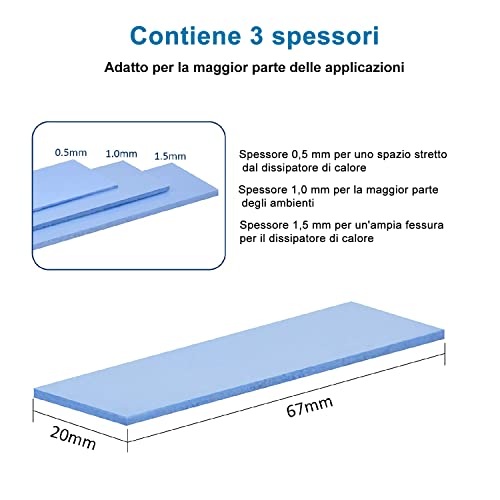 ADWITS 9 pezzi assortiti spessore 0,5 1,0 1,5 mm cuscinetti termoconduttivi in silicone con conduttività termica 6,0 W/mk, morbido sicuro Semplice da applicare per SSD CPU GPU-Blu