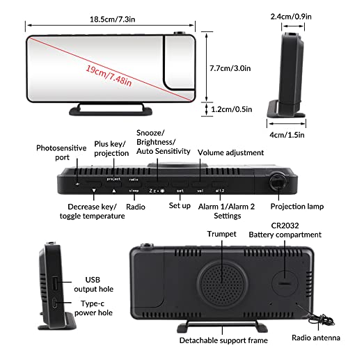 【Stazione radio FM e timer di spegnimento】 -La radiosveglia con proiezione ha le funzioni di ricerca automatica, blocco automatico e memorizzazione automatica (gamma audio FM87.5MHZ-108MHZ) funzione timer di spegnimento. Trascorso il tempo impostato (da 5 a 90 minuti) la radio si spegne automaticamente. Per una ricezione più stabile è presente un'antenna da 83 cm sul retro del dispositivo.