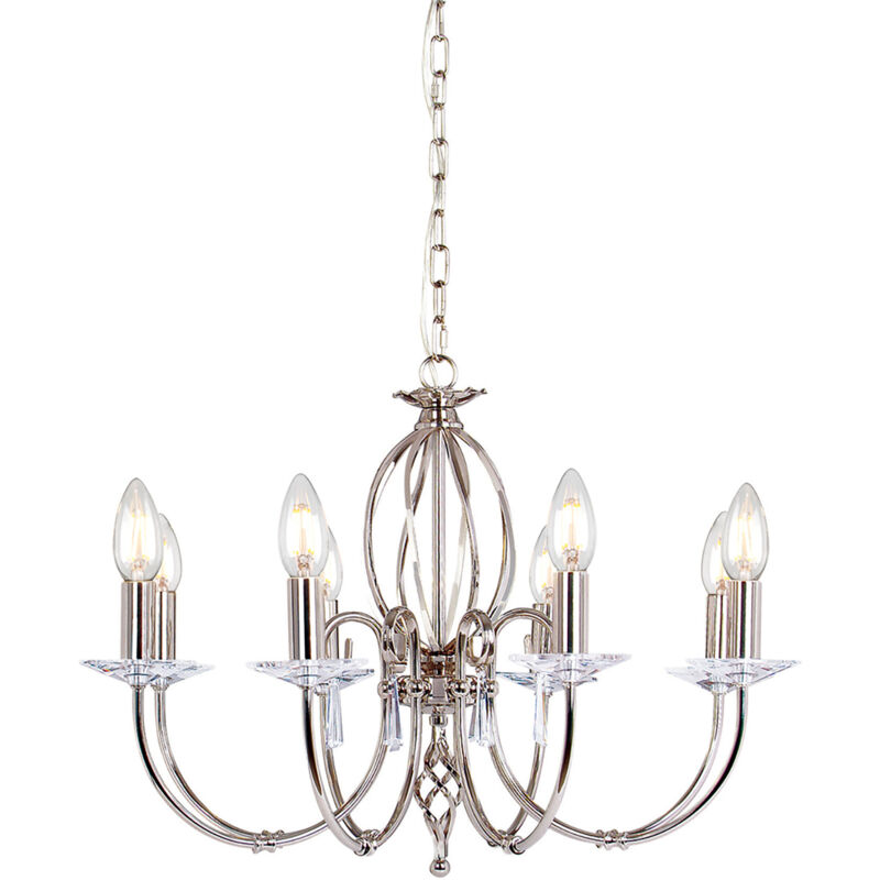 Collezione Aegean GOCCE DI VETRO SCINTILLANTI Lampadario a 8 luci - Nichel lucido. L'elegante famiglia Aegean è caratterizzata da volute e ricci metallici forgiati a mano, arricchiti da gocce e portalampade di vetro sfaccettato ed è disponibile in tre finiture: nichel altamente lucido, ottone lucido e ottone anticato. La serie Aegean, comprensiva di due modelli di lampade da parete e tre a sospensione, convertibili a soffitto, arricchisce sia agli ambienti classici che contemporanei.