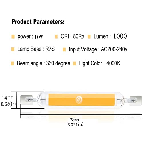 [Luce LED R7S 10W 78mm]: Lampadina LED hightlight 10W R7S 78mm dimmerabile, 1000LM, LED COB a doppia estremità, bianco naturale 4000K con un angolo di diffusione della luce di 360 gradi, garantisce una diffusione uniforme della luce. Il materiale ceramico garantisce una buona trasmissione della luce, un'elevata resa cromatica (CRI> 80)
