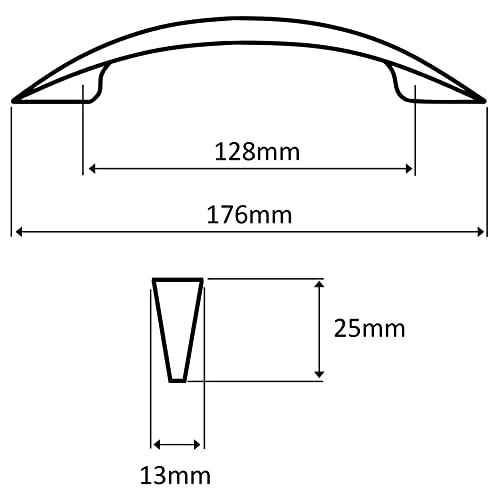 Dimensioni: Interasse tra bulloni/viti: 128mm. Lunghezza: 176mm. Altezza: 25mm. Larghezza: 13mm. Numero di fori di montaggio: 2. Peso del set: una maniglia per mobile + 2 viti = 75 g. La viteria è fornito. Materiale: metallo. Finitura: argento opaco