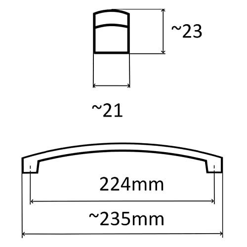 Dimensioni: Interasse tra bulloni/viti: 224mm. Lunghezza: 235mm. Altezza: 23mm. Larghezza: 21mm. Numero di fori di montaggio: 2. Peso del set: una maniglia per mobile + 2 viti = 69 g. La viteria è fornito. Materiale: metallo. Finitura: argento opaco