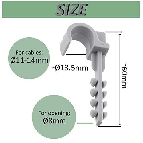 Dimensioni: per cavo con diametro da Ø11 a 14mm. Lunghezza: circa 60mm. Diametro di foratura: Ø8mm. Peso unitario: 2.7 g. Materiale: plastico. Colore: nella gamma del grigio