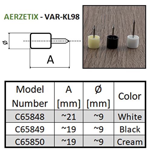 Dimensioni: Diametro: 10mm. Lunghezza: 21mm. Peso unitario: 0.56 g. Materiale: supporto in plastica e chiodo in metallo. Colore: bianco. Vedere le immagini