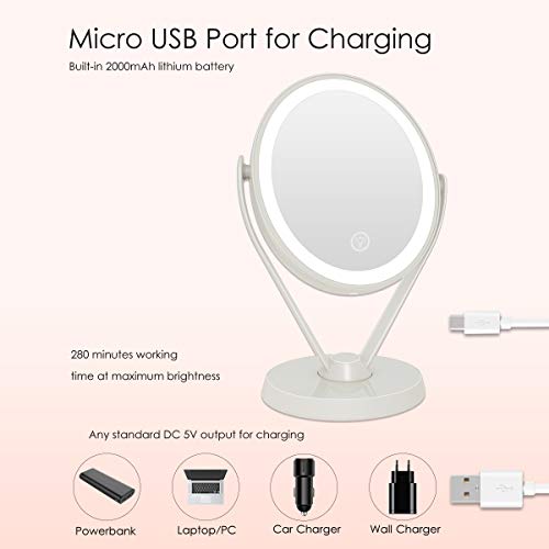 ✔ Specchio illuminato a LED ricaricabile USB - La batteria incorporata da 2000 mAh al litio offre fino a 280 minuti di tempo di lavoro per gli specchi cosmetici LED alla massima luminosità con luci naturali brillanti. Porta micro USB per la ricarica, è possibile utilizzare qualsiasi presa DC 5V standard per caricare, il cavo USB incluso
