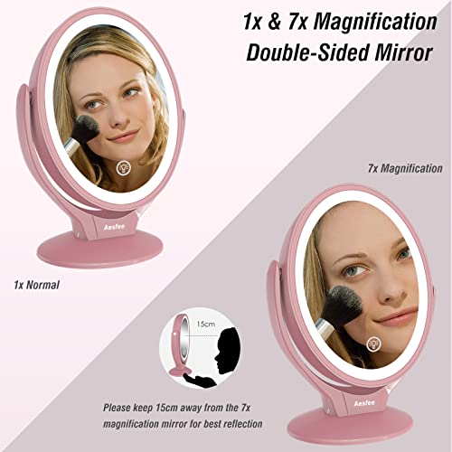 Aesfee Specchio da Trucco con Luci LED, Ingrandimento 1x/7x specchio Cosmetico a Doppia Faccia Ruotabile di 360°, Interruttore Tocca, Specchio Illuminato Portatile per Viaggio,Bagno