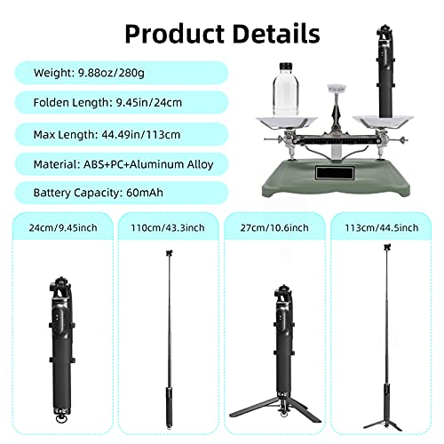 [Treppiede per selfie stick da 44,5 pollici]: questo bastone per selfie può essere esteso da 9,45 pollici/24 cm a 44,5 pollici/113 cm, può essere regolato alla lunghezza che ti piace per scattare foto o video.