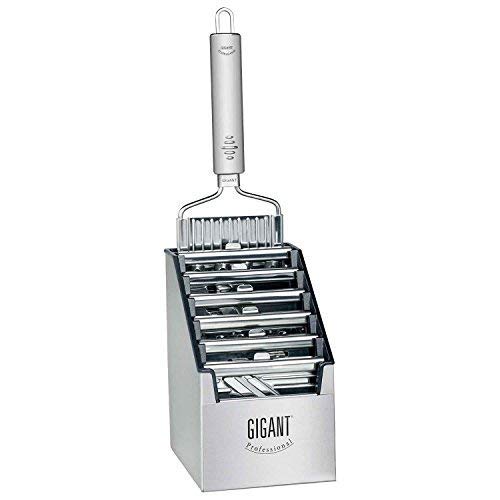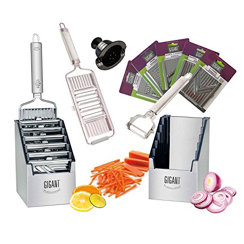 Tutto dentro il set Muxel Mega:L'affettaverdure Gigant con 4 lame in acciaio inox con 6 accessori nell'elegante confezione multi.