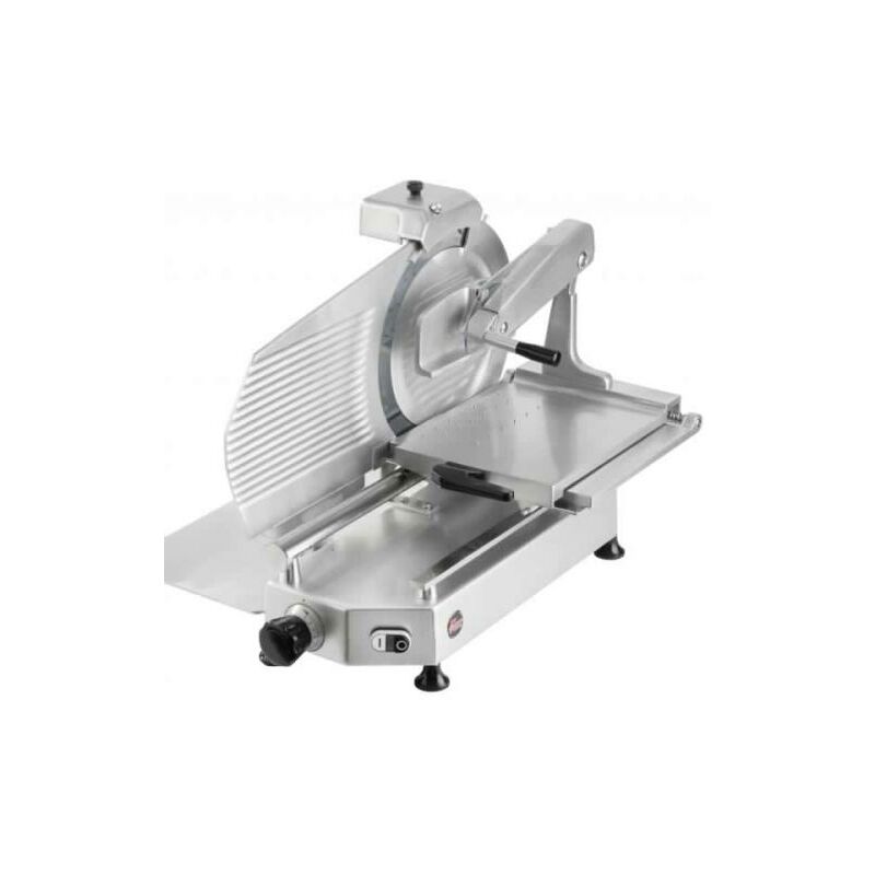 Codice RS0055 - Affettatrice con lama verticale d.300 per salumi, modello FC-F300TS-V CE PRO, dimensioni cm. 42(55)x53(71)x55 (lxpxh), 230 volt, 370 watt, spessore di taglio 0-16 mm, taglio utile cm. 26x20, affilatoio incorporato. Costruzione secondo gli standard CE uso professionale in alluminio anodizzato, con lama di acciaio temprato e cromato. Motori da 115-220-240 V, 50-60 Hz. Rispondente alle più rigorose esigenze igieniche. Regolazione spessore di altissima precisione (1/10 mm). Carrello per alimenti montato su cuscinetti a sfere che assicurano uno scorrimento eccezionalmente morbido. Piedini di gomma che assicurano una buona presa sulla superficie di lavoro e quindi operazioni sicure. Dotata dei seguenti dispositivi di sicurezza: micro sul coprilama, blocca cavo, parti elettriche completamente protette, paramani per il piatto, anello fisso attorno alla lama, blocco dell'affilatoio (quando incorporato). Lame opzionali per pane e formaggio.