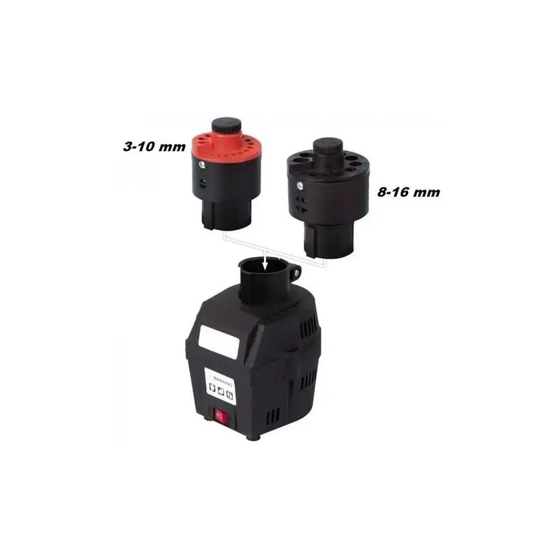 Affilatore elettrico di punte in metallo. �3 à �10 mm con seconda testa in dotazione �8 à �16 mm Mola di affilatura �58 mm grana 80. Regolazione dellaltezza della mola senza smontaggio. Permette di avere punte di svariate misure (da �3 à �10 mm) (�8 à �16 mm) sempre perfettamente affilate. La mola interna di affilatura e regolabile in altezza per permettere di affilare anche le punte più corte. Alimentazione 230 V-50 Hz Regime: 1600 g/min Punte Di Misura della prima testa:3 - 3,5 - 4 - 4,2 - 4,5 - 5 - 5,5 - 6 - 6,5 - 7 - 7,5 - 8 - 8,5 - 9 - 9,5 - 10 mm Punte Di Misura della seconda testa 8 - 8,8 - 9,5 - 10,3 - 11 - 12 - 12,7 - 13,5 - 14,3 - 15 - 16 mm Potenza Motore 70 WATT 1600 GIRI/MIN. Contenuto della confezione: 1 Affila punte 1 Adattatore da 8-16mm Permette di avere punte di svariate misure Mola di affilatura �58 mm grana 80. La mola interna di affilatura e regolabile in altezza