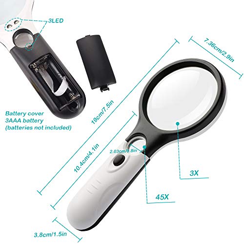 The magnifier is made of high quality glass. White Energy-efficient LED bulbs require 3 AAA batteries lasting for a long time (batteries not included) The stylish color combined black and white.