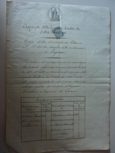 AGENZIA DELLE IMPOSTE DIRETTE DI SALA CONSILINA Copia della Domanda di Voltura N.° 513 del 14 Novembre 1874 in Comune di Tegiano