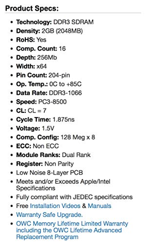OWC Kit di aggiornamento della memoria da 4,0 GB (2X 2 GB) PC8500 DDR3 1066 MHz a 204 pin compatibile con MacBook Pro, MacBook, Mac Mini e iMac, (OWC8566DDR3S4GP)