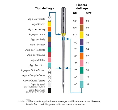 Marcatura a colori SCHMETZ: l'ago è chiaramente riconoscibile anche senza confezione. Marcatura a colori nella parte superiore dell'Ago per Jeans = blu, dell'Ago Stretch = giallo, la marcatura a colori in basso indica la finezza dell'ago;