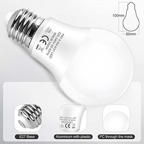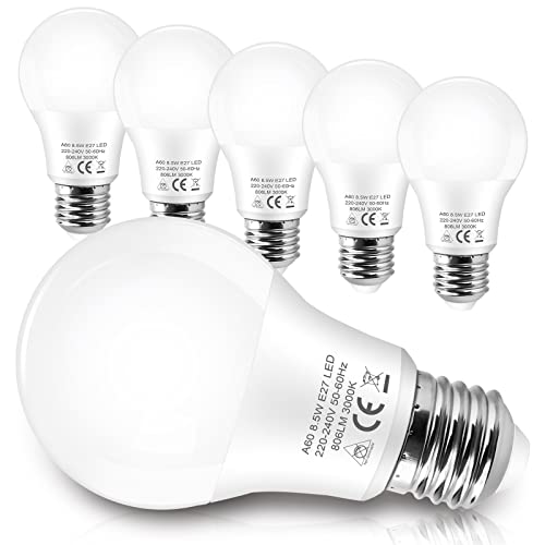 AGOTD Lampadina LED E27 8,5W Equivalenti a 60W, Luce Bianca Calda 3000K, Lampadina Super Luminosa e Risparmio Energetico,Lampadine LED 806 Lumen, Pacco da 6 Pezzi