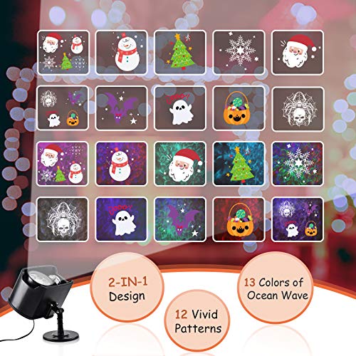 ❄ [12 SCHEMI 13 ONDE] Ci sono 13 tipi di increspature dell'acqua e 12 tipi di motivi di Halloween / Natale tra cui scegliere, tra cui albero di Natale, fantasma di Halloween ecc. 2-in-1 LED proiettore, la gamma del modello di proiezione è fino a 15 m, l'onda dell'acqua è di 6 m (fino a 10 m in un ambiente molto buio).