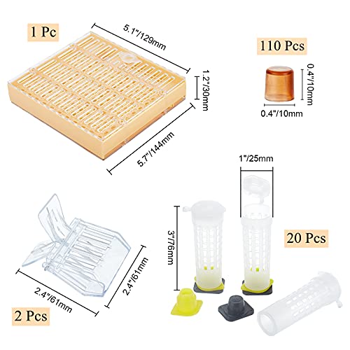 La confezione include: 1 scatola per coltivazione, 2 pezzi di plastica acchiappa ape regina, 20 pezzi per gabbia e copertura per gabbia, 110 pezzi per protezioni di sicurezza. Attrezzo per l'allevamento delle api regine economico e pratico, adatto agli apicoltori, tutti i componenti sono riutilizzabili.