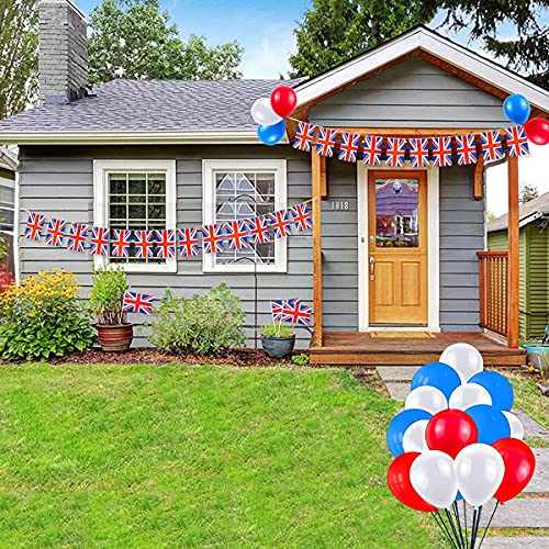 AhfuLife Set di 30 bandierine britanniche con bandiera inglese, 10 m, 10 bandierine con bandiera Union Jack e 30 palloncini rossi bianchi e blu per decorazioni per feste regina del platino 2022 VE Day