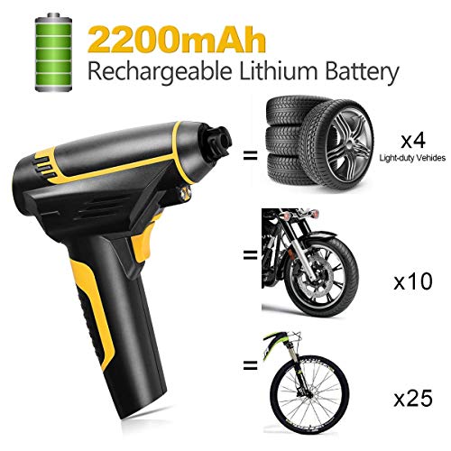 Portatile e senza fili - aibesser portatile gonfiator è facile da trasportare. Lunghezza del cavo di alimentazione: 150 cm, capacità batteria: 2200 mAh, dimensioni: 23*18*5.2 cm, peso: 1140 g, 3 pezzi ugello adattatori equipaggiato con tronco, si adatta in un cassetto portaoggetti, o sotto un sedile, usarlo quando ne hai bisogno.