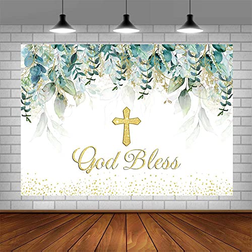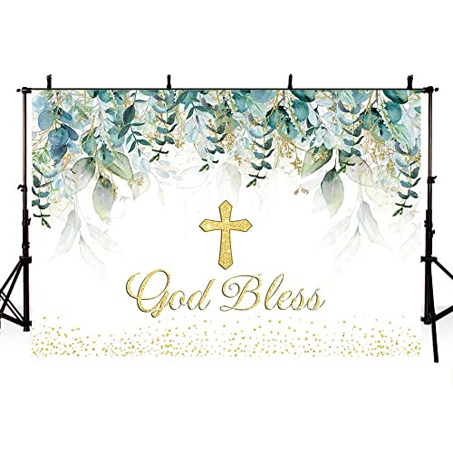 AIBIIN 2,1 x 1,5 m verde Dio benedica sfondo verde e oro foglie verdi eucalipto sfondo fotografia prima comunione battesimo decorazioni foto puntelli