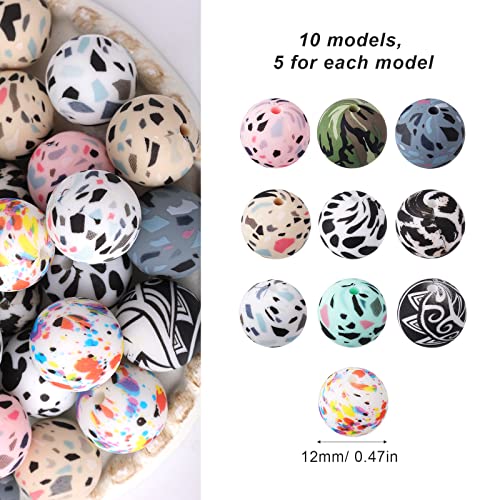 AIEX 50 Pezzi Perline in Silicone per Braccialetti, Stampe Decorative Perline Sfuse Perline Rotonde per Braccialetti Perline Alla Rinfusa con Fori per Artigianato Gioielli Collana Fai Da Te (12mm)