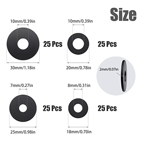 Contenuto della confezione: riceverai 100 pezzi rondelle di gomma piatte in 4 dimensioni (diametro esterno x diametro interno), inclusi 18 x 8 mm/ 0,7 x 0,31 pollici, 20 x 10 mm/ 0,8 x 0,4 pollici, 25 x 7 mm/ 1 x 0,28 pollici, 30 x 10 mm/ 1,2 x 0,4 pollici . E ogni rondella di gomma ha uno spessore di 2 mm/ 0,08 pollici. La quantità e le dimensioni sono sufficienti per soddisfare le vostre esigenze di uso quotidiano e sostituzione.