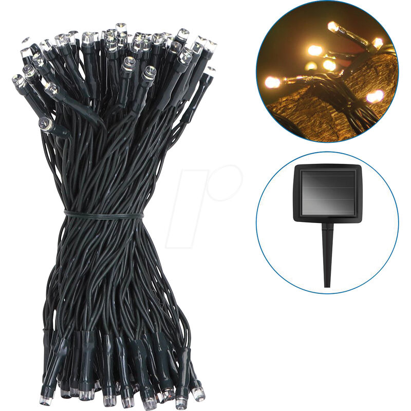 Ghirlanda luminosa a energia solare da 100 LED con sensore automatico giorno/notte, adatta per uso esterno (IP44), colore della luce bianco caldo Caratteristiche: - Numero di LED: 100 - Colore della luce: bianco caldo (2.700 - 3.000 K) - Protezione: adatto per uso esterno secondo IP44 - Batteria: 1x 400 mAh AA Ni-Mh (ricaricabile) - Sensore automatico giorno/notte - Modalità: continua o lampeggiante - Colore verde - Lunghezza: 11,9 m