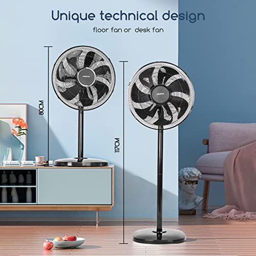 【2-IN-1 Ventilatore da pavimento】Il ventilatore da pavimento multifunzionale può essere utilizzato come ventilatore da pavimento o regolare facilmente l'asta telescopica e utilizzarlo come ventilatore da tavolo. Un unico ventilatore, adatto a una varietà di scenari d'uso, molto adatto per la casa, il soggiorno, la camera da letto o lo studio. Altezza del ventilatore da tavolo: 80 cm, altezza del ventilatore da tavolo: 117 cm.