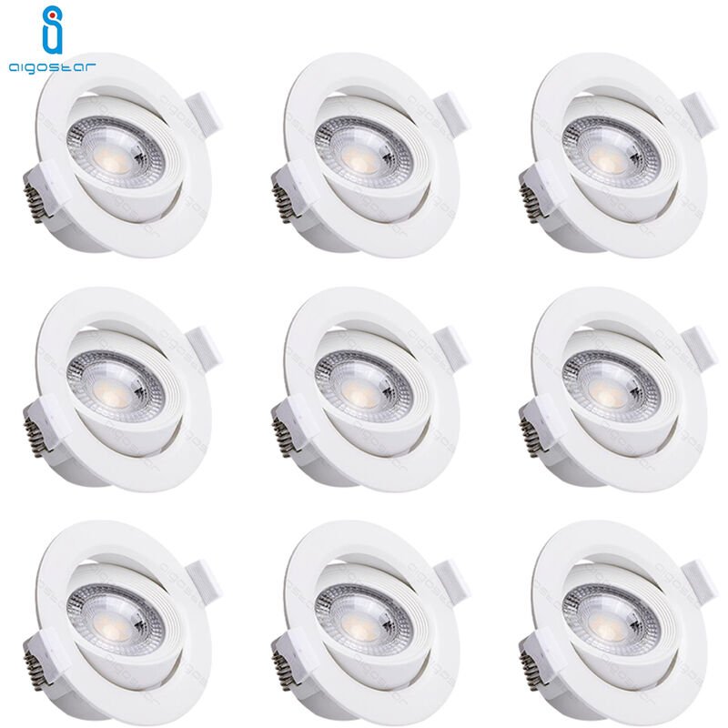 Kit 9x Faretti LED orientabili 5W | Aigostar Faretto LED orientabile da incasso, 5 Watt 3000K, dalla luce brillante con basso consumo d'energia, ideale per avere più punti luce, risparmiando in bolletta. Design e LED di alta qualità Il corpo del faretto è ultra sottile (appena 44mm), la parte orientabile permette di direzionare il fascio di luce in base alle esigenze (+30° a destra, +30° a sinistra). I chip LED di alta quaalità garantiscono comfort visivo, senza sfarfallio né abbagliamento. Inoltre la resa cromatica è ottimale (≥80), così da illuminare, mantenendo i colori naturali e realistici. Facile installazione Grazie alle clip a molla integrate può essere facilmente alloggiato all'interno della controsoffittatura o negli spazi preposti. Specifiche Colore: Bianco Tipo: Orientabile Modello: Circolare Colore luce: Bianco caldo Dimensioni: D90xH44mm Dimensioni foro: D75-80mm Consumo: 5W Voltaggio: 220-240V Corrente: 45mA Frequenza: 50hz Temperatura colore: 3000K Flusso luminoso
