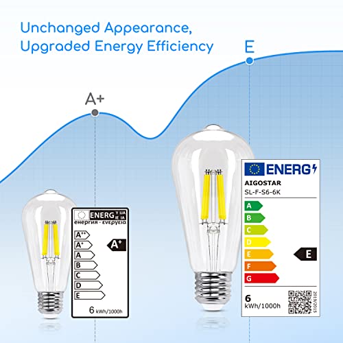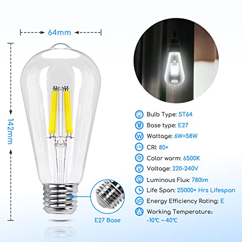 Aigostar Filamento Lampadine Led E27 Luce Fredda 6500K,6W Equivalenti a 58W,780Lm,ST64 Stile Vintage, Non Dimmerabile, Pacco da 6 Pezzi