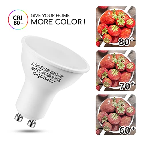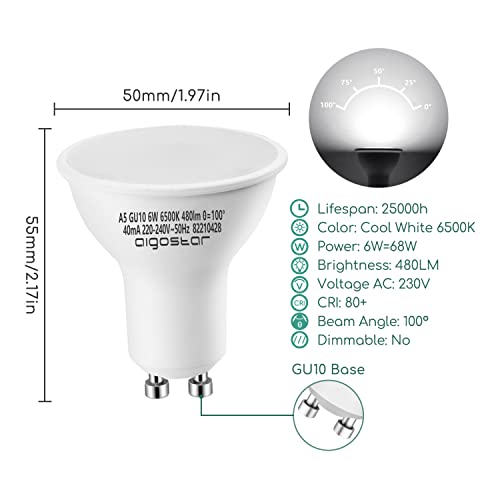 Aigostar Lampadina LED GU10 6W, Luce Bianca Fredda 6500K 480 Lumen, Angolo a Fascio 120-160 Gradi, Nessun Sfarfallio, Pacco da 10