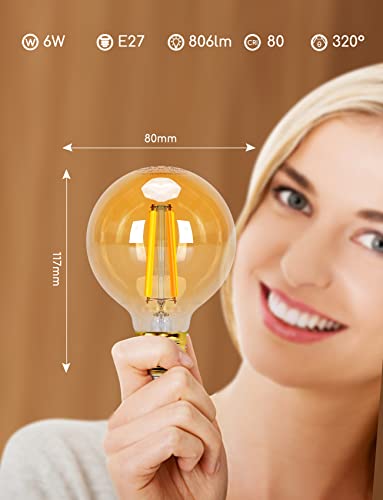 Aigostar Lampadina Vintage Smart, E27 LED 6W Ambra Lampadine Filamento a Globo G80, 806 LM Bianco Caldo Dimmerabile 2700K - 6500K, Compatibile con Alexa e Google Home, 2.4GHz WiFi