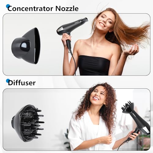 【Diffusore e concentratore】 phon con diffusore aiuta a definire i ricci e le onde naturali, e il concentratore consente un flusso d'aria concentrato, rendendo i capelli lisci ed eleganti. Cavo da salotto di 1,75 metri con gancio, facile e compatta. Filtro rimovibile è facile da pulire.