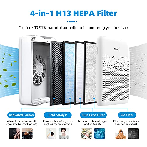 【Efficienza Aumentata del 99.9%】Il filtro HEPA H13 del purificatore d'aria adotta una filtrazione a 4 stadi. Può eliminare efficacemente il 99,9% degli inquinanti atmosferici di casa e camera da letto, come capelli, odori, fumo nocivo, polvere, polline, peli di animali domestici, ecc.